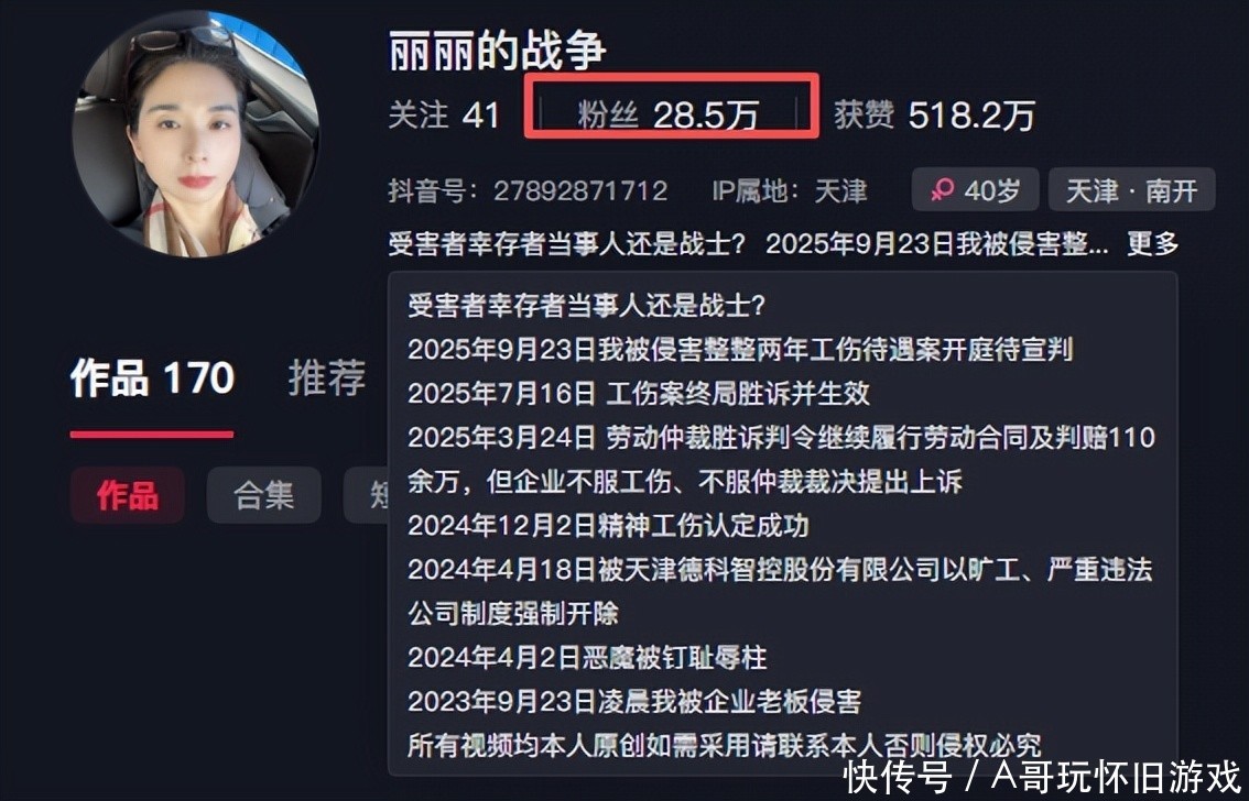 但崔丽丽的行为模式完全相反,账号上不断发视频证明自己的抵抗意志有多顽强,不断开直播引起争执,而作为“第一起”此类案件判定为工伤的受害者,崔丽丽更是抓住了这个标签狠狠的“宣传”自己。